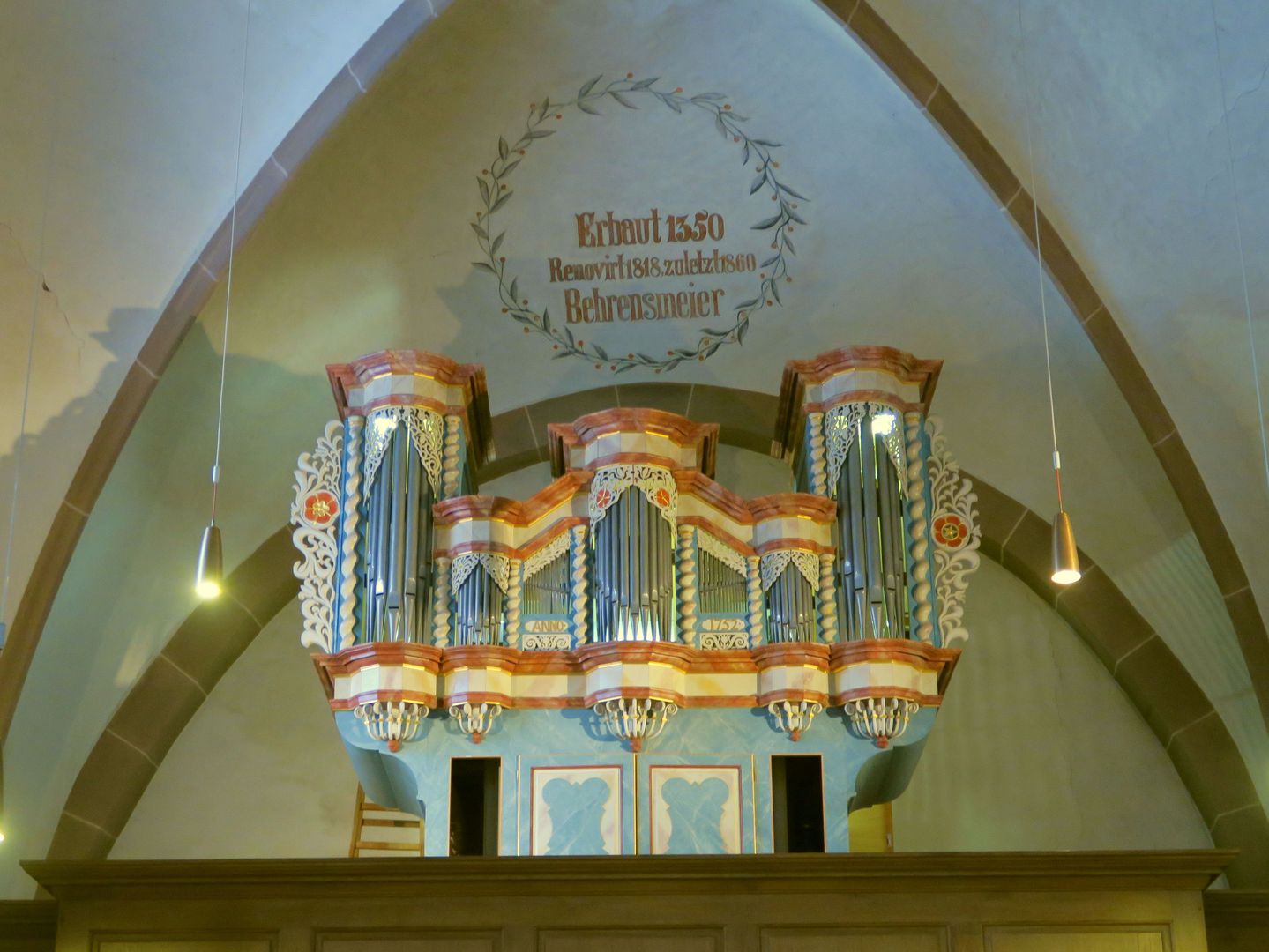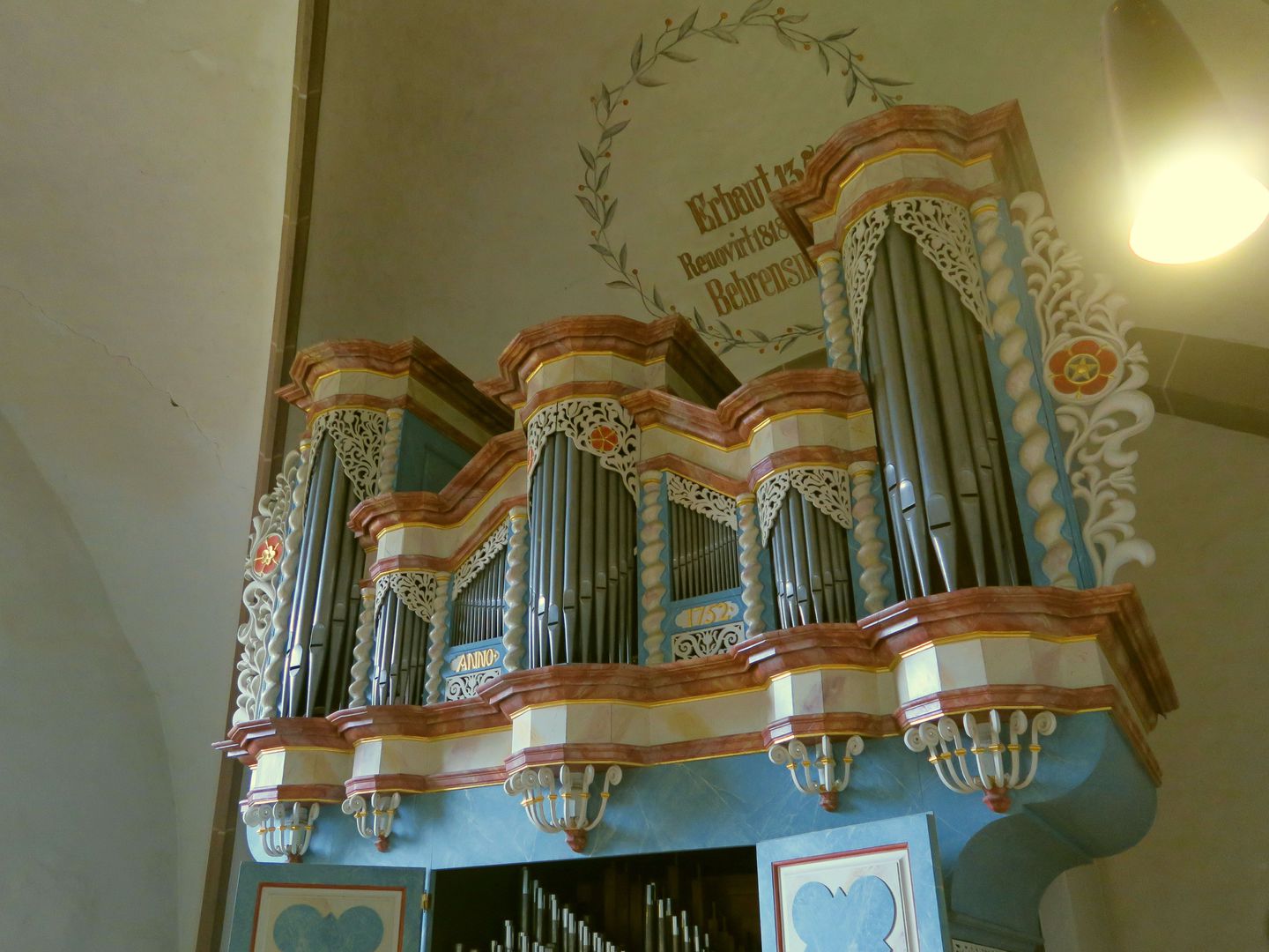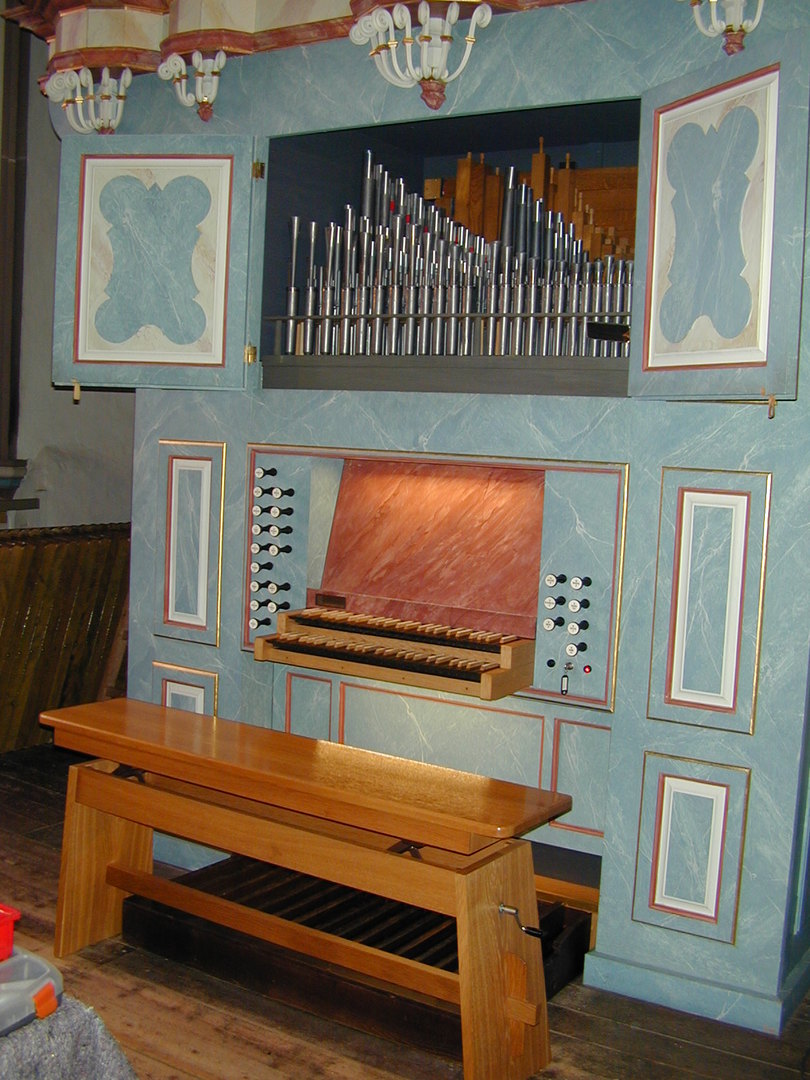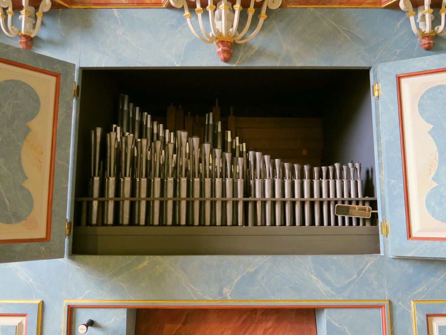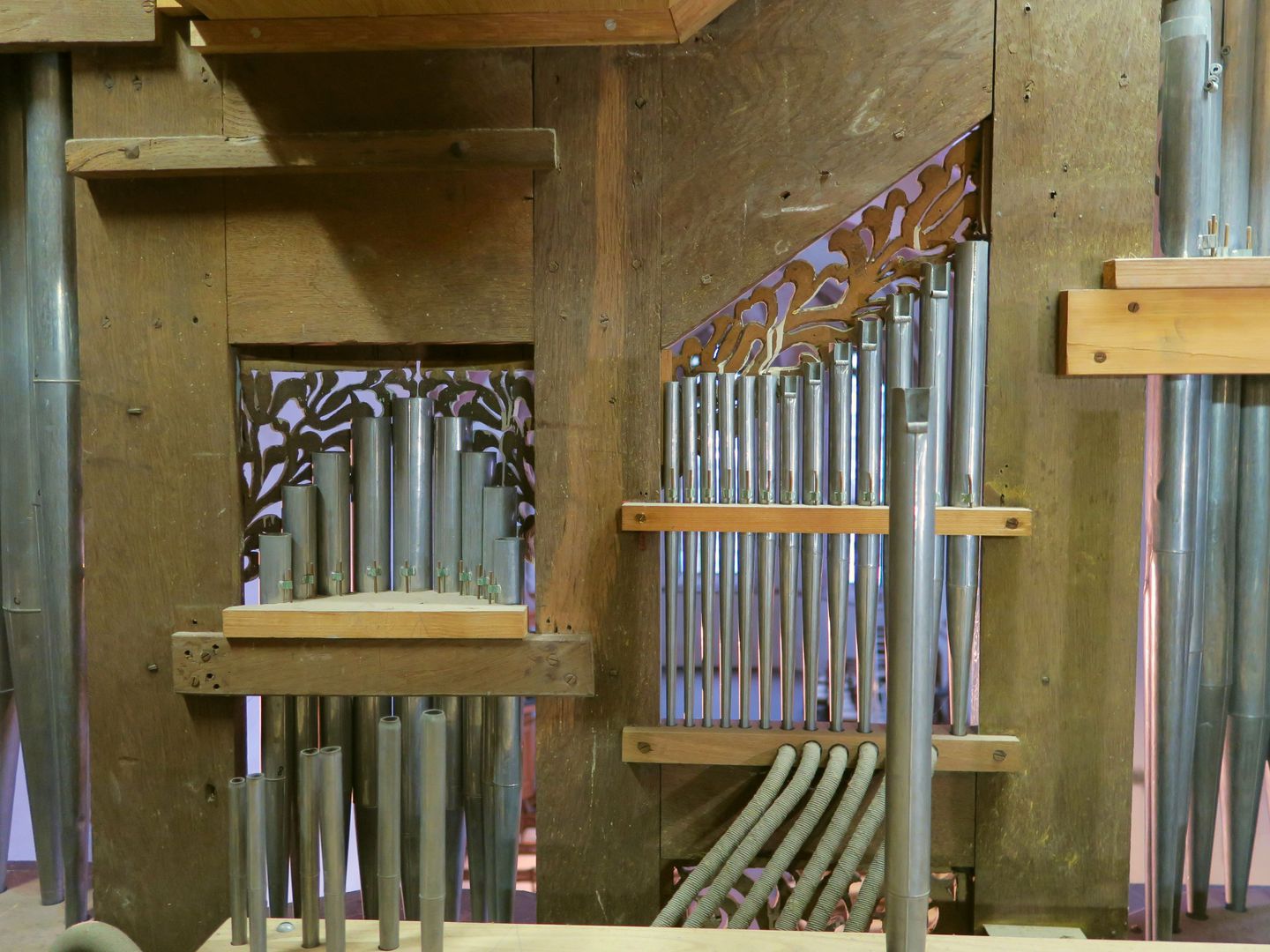 Neben wesentlichen Teilen des Gehäuses sind auch noch mehrere Pfeifenregister in der Substanz von Fuß und Körper mit neu aufgesetzten Kernen erhalten.