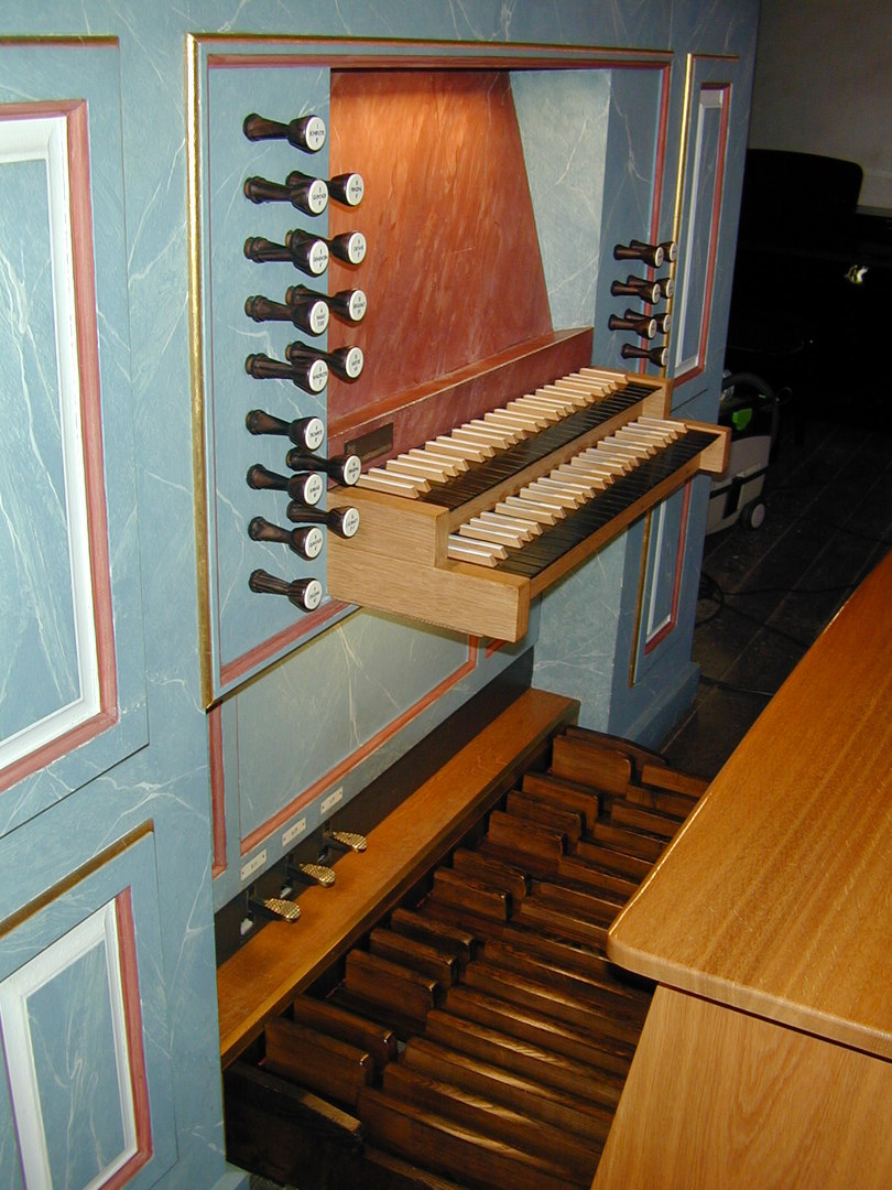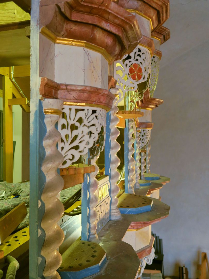 Neben Reinigungsarbeiten war auch eine Schimmelbehandlung an vielen Gehäuseteilen, Abstrakten und Holzpfeifen fällig.