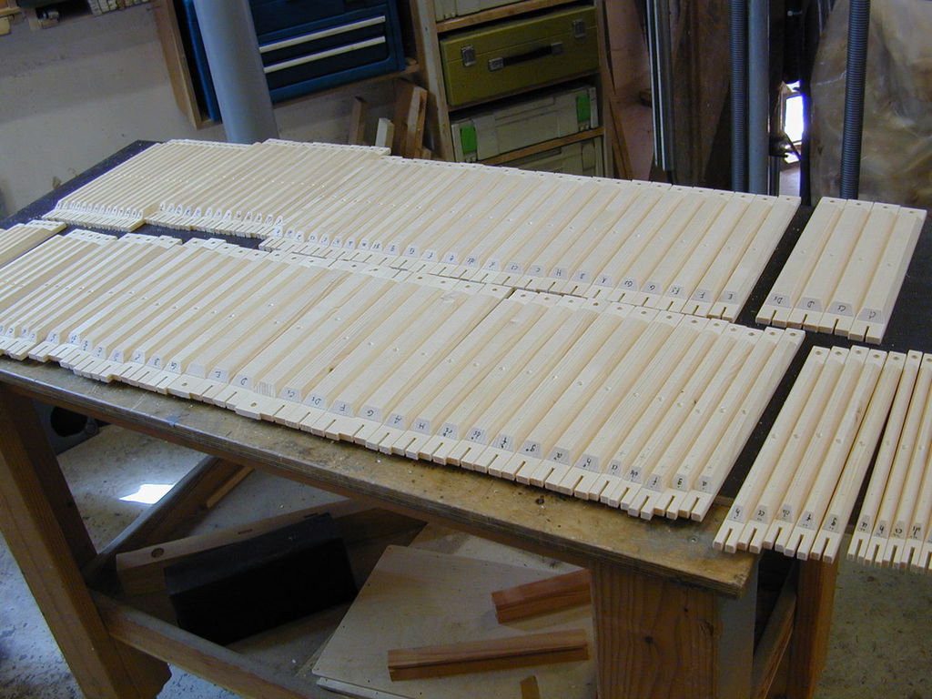 Dabei wurden die Windladen vom Hauptwerk, Brustwerk und Pedal ausgebaut und in der Werkstatt grundlegend saniert. Der Schaumstoff auf der Ventilauflage wurde entfernt und die Ventile neu beledert. Abzugsdrähte, Aluminium-Trakturverbinder und Pulpeten wurden erneuert.
