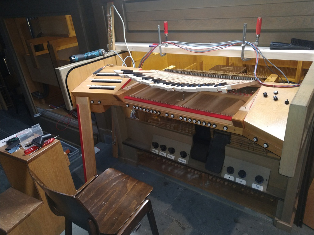 Am Spieltisch werden nach gründlicher Reinigung neue LED-Leuchten für Pedal und Noten istalliert.
