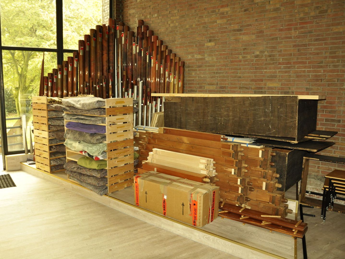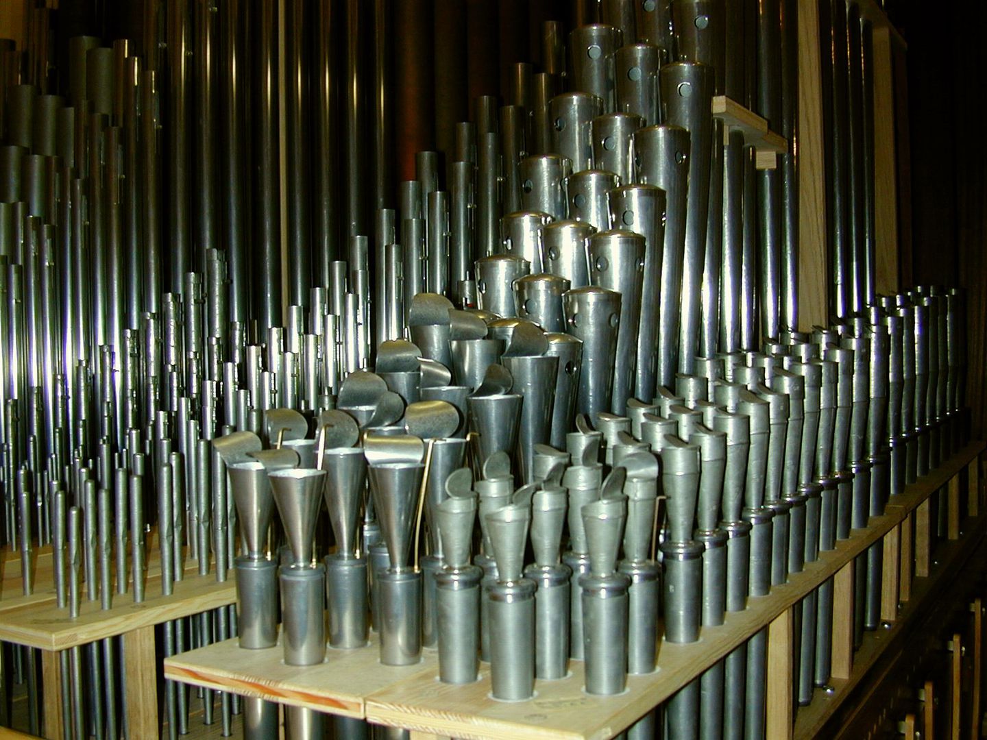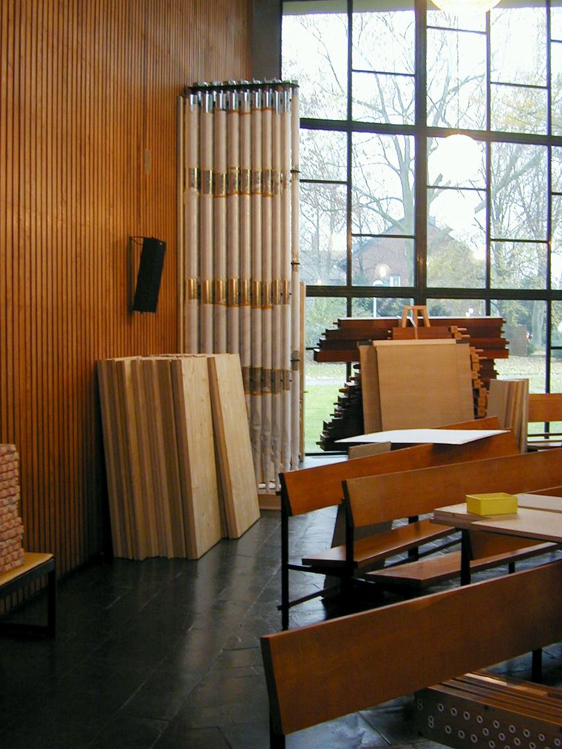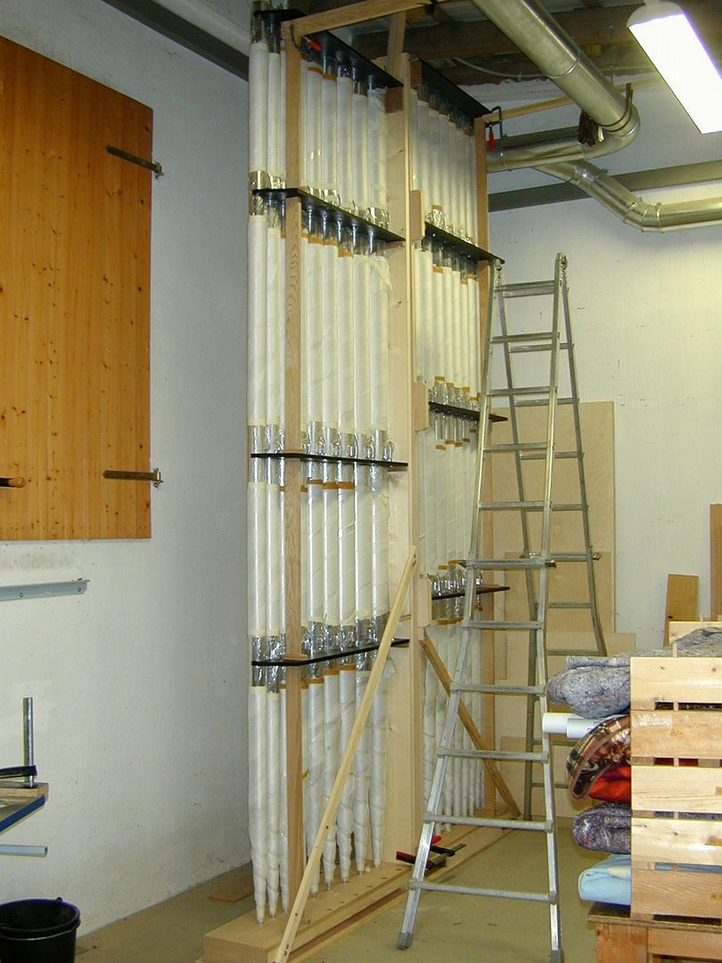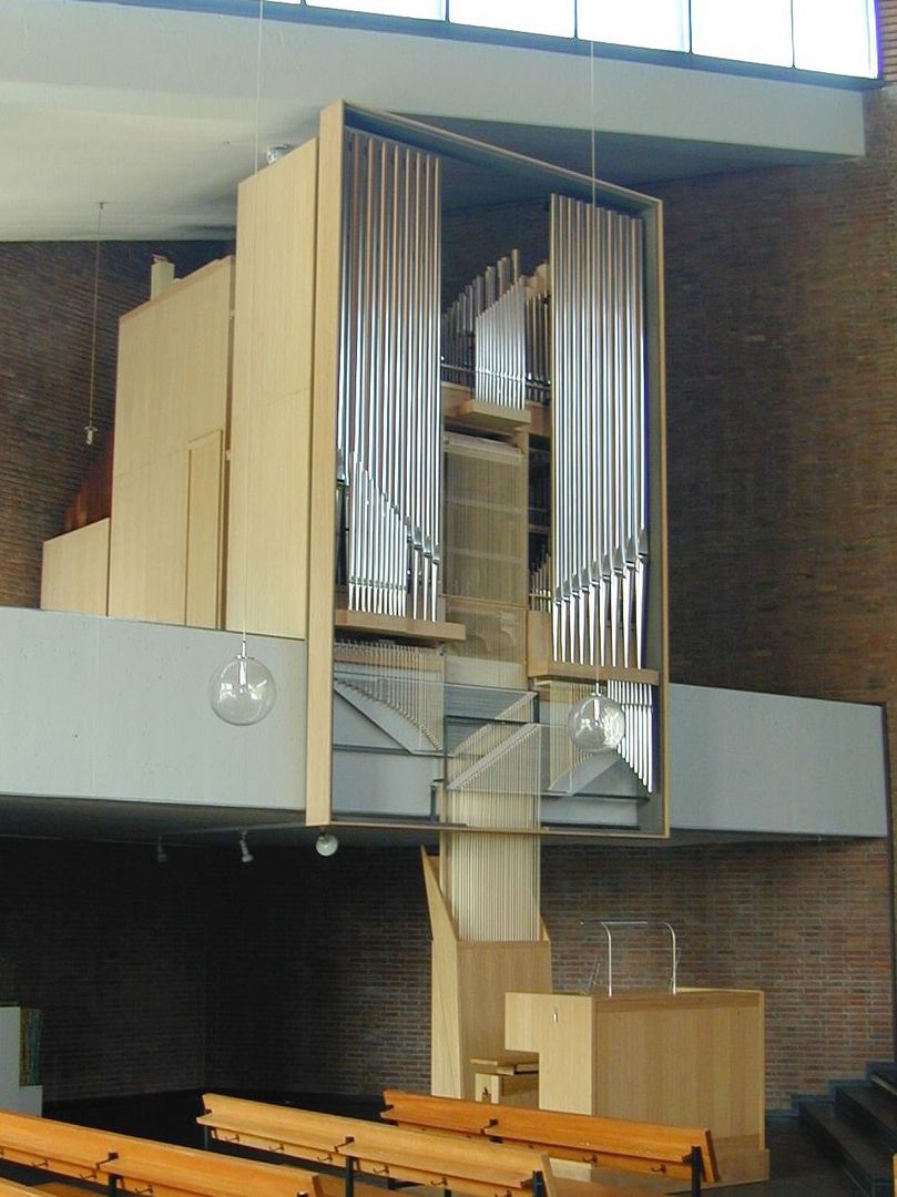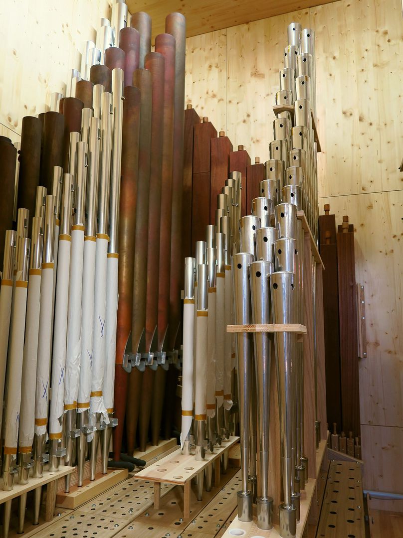 Der Großteil des Pfeifenwerks stammt aus der Vorgängerorgel der Firma Willi Peter. Auch zwei der Windladen fanden Wieder-verwendung in Pedal und Schwellwerk.