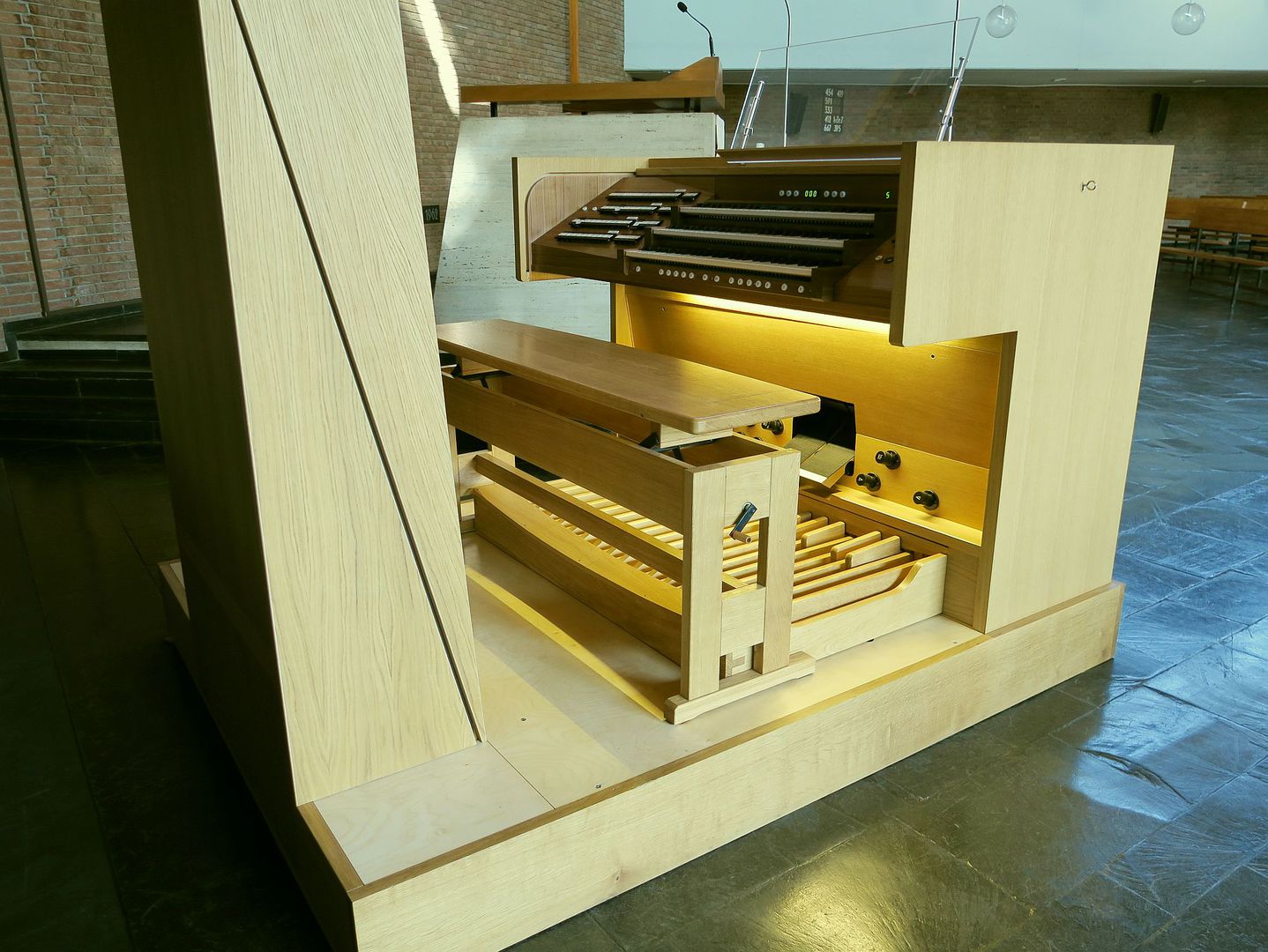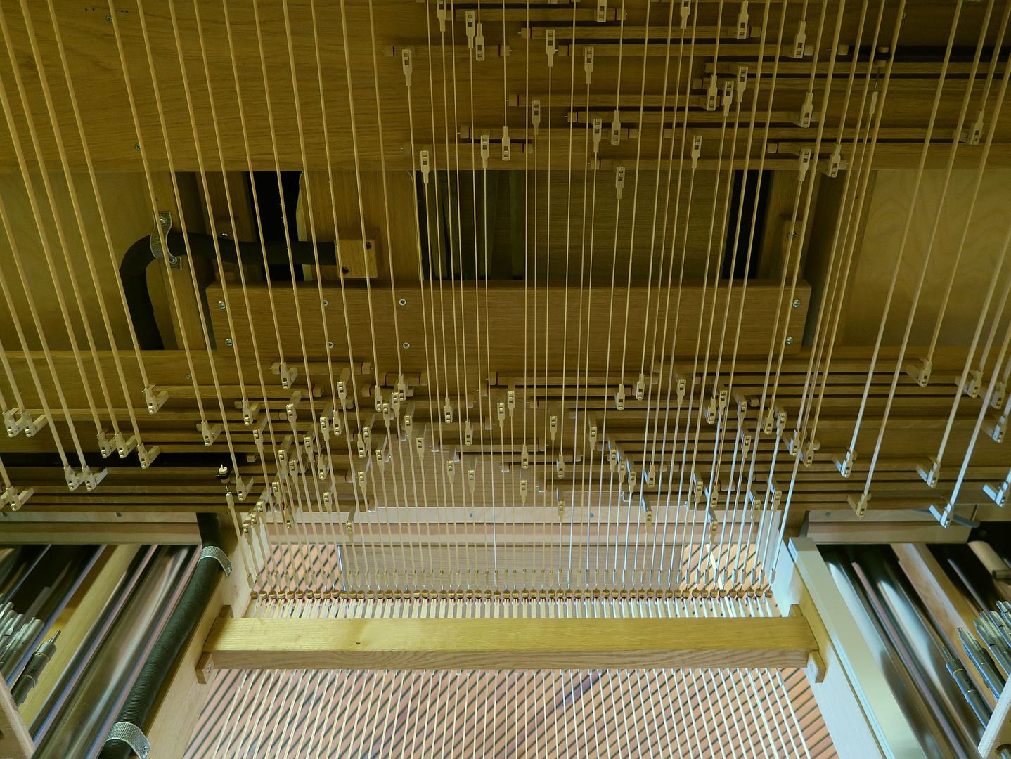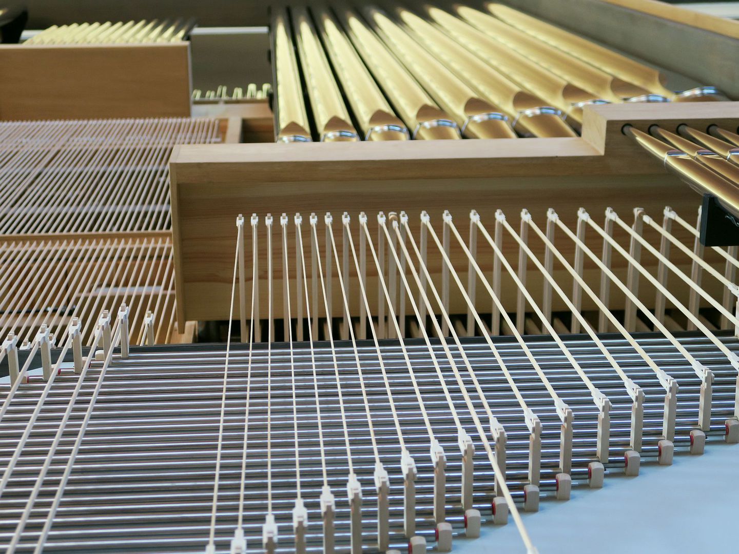 Schleifladen mit elektrischer Registertraktur und mechanischer Spieltraktur für das I. und II. sowie elektrischer Spieltraktur für das III. Manual | ||