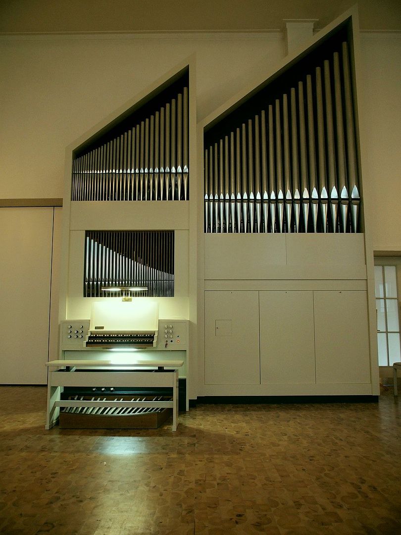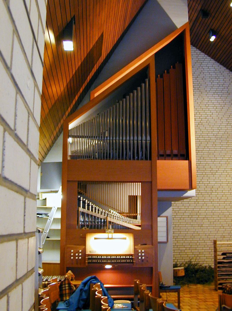 Das 1974 für die Kirche in Bochum Laer errichtete Instrument wurde von uns in den Gemeindesaal in Eppendorf transferiert und dazu baulich und farblich verändert.