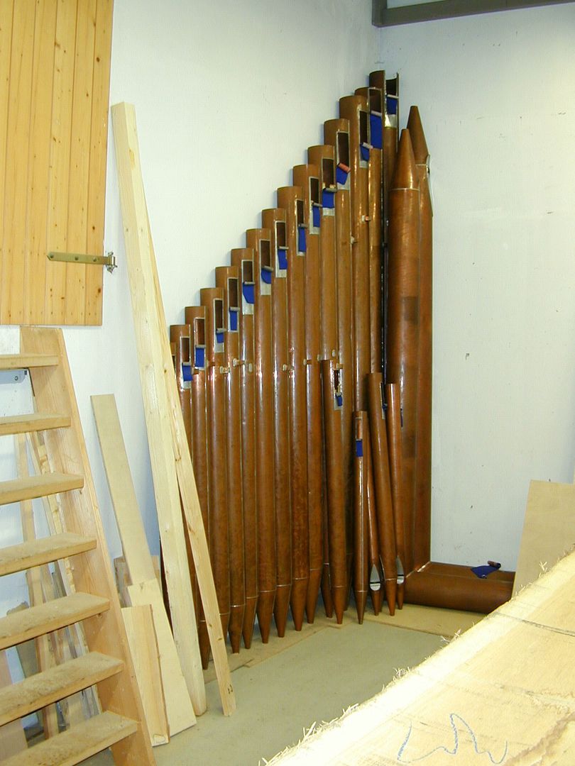 Die Bassregister des Pedals wurden aus den Pedaltürmen entfernt und auf neu gefertigten Windladen hinter der Orgel unter-gebracht, um ihre Windversorgung und Aussprach-Möglichkeit zu verbessern.