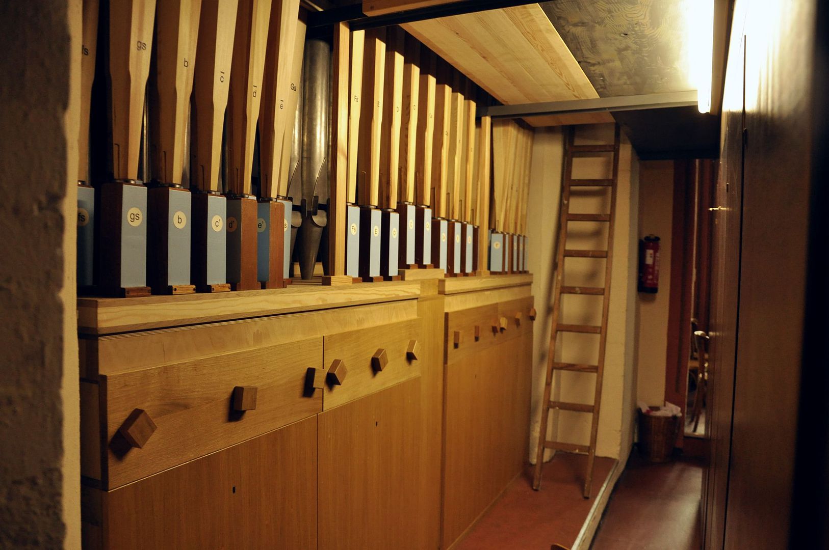 Um eine bessere Spielbarkeit zu erreichen wurde der gesamte Koppelaufbau im Spielschrank abgebaut. Die Koppeln sind seither elektrisch, die Windladen wurden zudem im Bassbereich mit Balanciers ausgestattet.